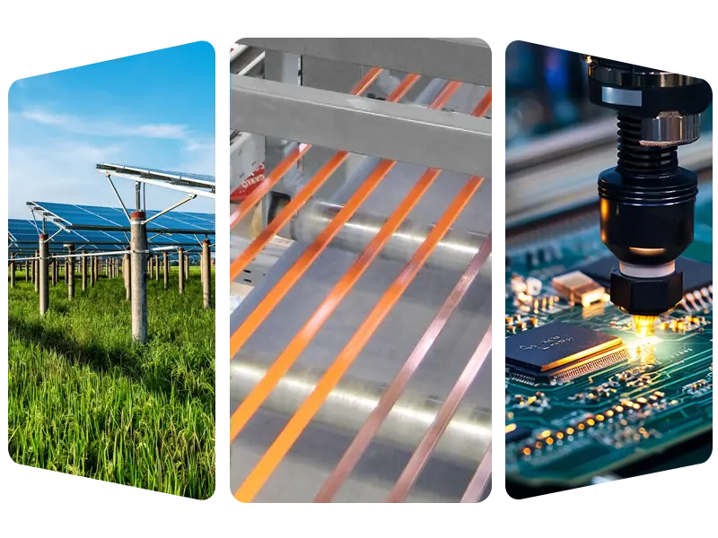 • Fotovoltaikus mező: fotovoltaikus hegesztőszalagok és gyűjtősínek tömeggyártása az elektromos áram hatékony vezetésének elősegítése érdekében.